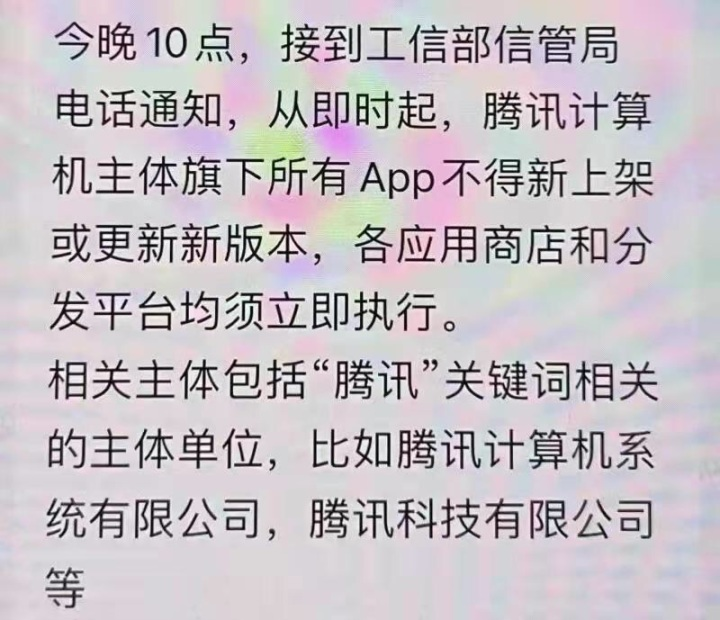 11月24日,网络传言即日起腾讯旗下所有App不得新上架或更新版本,各平台立即执行。