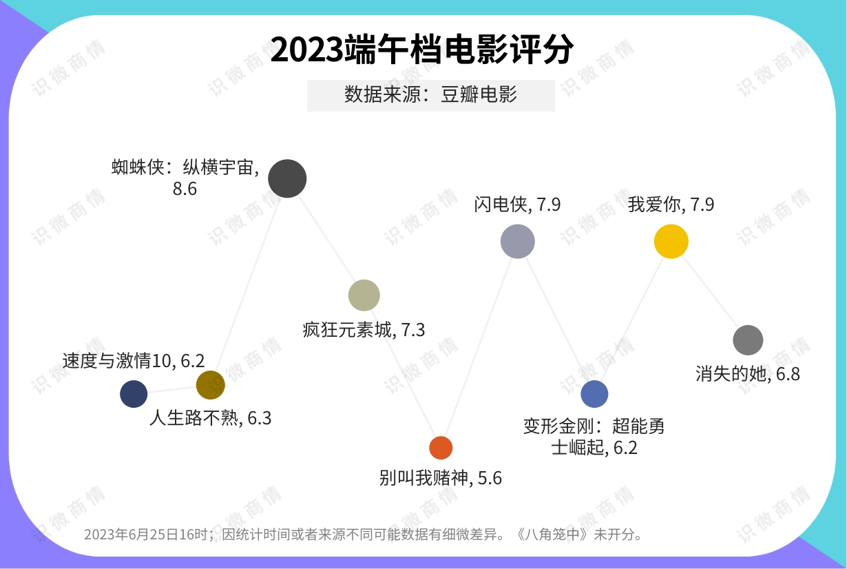 端午档票房前十的电影中,目前网络评分最高的是《蜘蛛侠:纵横宇宙》,唯一破8分的作品。从端午档新上映的电影来看,《我爱你!》是目前网络评分最高的电影,7.9分(刚开分的时候上了8分线),其次是《消失的她》6.8分(刚开分时上了7分线),《别叫我“赌神”》最低5.6分,低于及格线。《八角笼中》是点映作品,尚未开分。