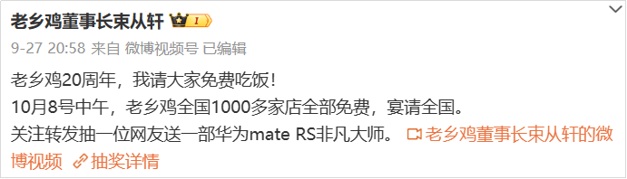 据悉,老乡鸡的20周年营销活动是自9月26日正式开始,由官博发布的“20连抽”打头,后续将连续20天开启新的抽奖。