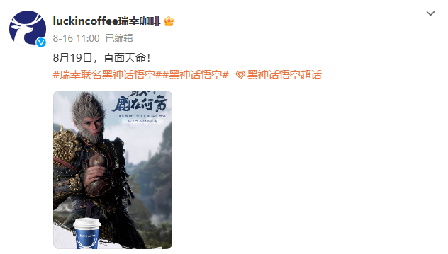 2024年8月16日11:00,瑞幸咖啡在社交媒体上官宣,“8月19日,直面天命!”受到广大游戏玩家点赞支持。