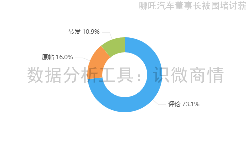 该段时间内,有关“哪吒汽车董事长被围堵讨薪”的舆情信息以评论为主,占73.1%;其次为原帖,占16.0%;转发较少,占10.9%。