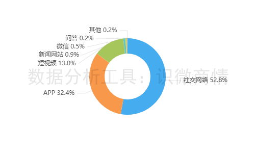 该时段内,有关“宗馥莉辞职事件”的舆情主要集中在社交网络平台,约占52.8%,其次为新闻APP(约占32.4%),短视频(约占13.0%)。