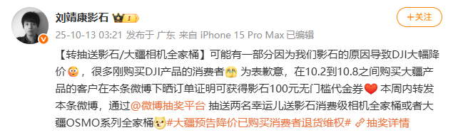 10月13日,影石创新CEO刘靖康发文称,“可能有一部分因为我们影石的原因导致DJI大幅降价”,并为10月2日至8日购买大疆产品的用户提供100元无门槛代金券(需晒单),同时发起抽奖活动(奖品包括大疆和影石产品)。