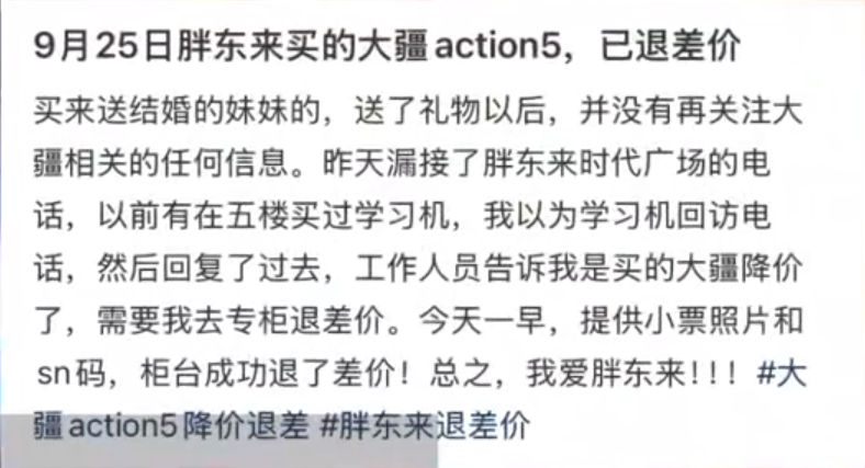 2025年10月7日,红星新闻发布《大疆预告多款产品降价数百元 社交平台上多名消费者晒出退货截图》报道,同时发起“大疆预告降价已购买消费者退货维权”话题讨论,引发广泛关注。