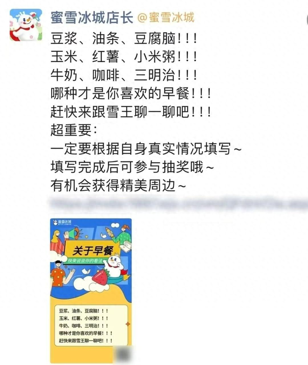 11月中下旬,蜜雪冰城通过企业微信社群、朋友圈向消费者发放早餐调查问卷,涵盖豆浆、油条、胡辣汤等20余种中西式早餐品类,同时收集性别、年龄、消费预算等用户信息,为产品落地做准备。