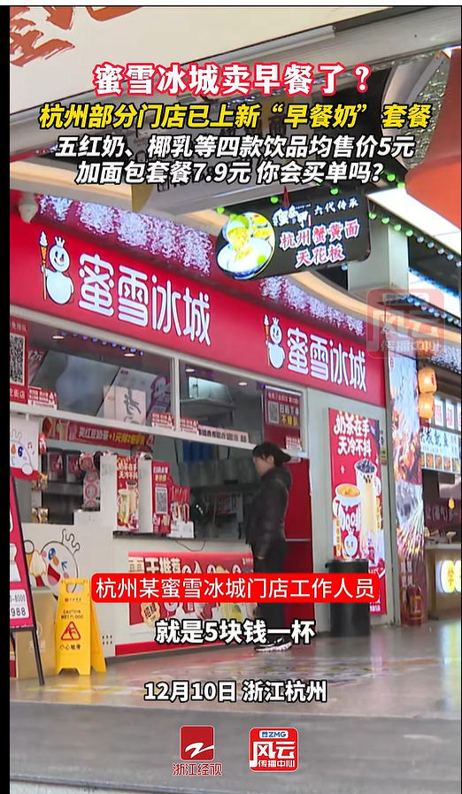 12月10日,媒体报道“蜜雪冰城开始卖早餐了”,记者发现杭州已有部分门店开启早餐售卖服务,门店大多集中在地铁站附属商业街区。