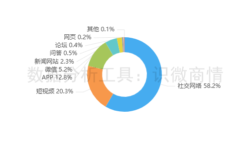 该时段内,有关“蜜雪冰城卖早餐事件”的舆情主要集中在社交网络平台,约占58.2%,其次为短视频(约占20.3%),新闻APP(约占12.8%)。