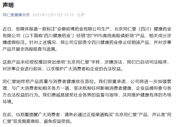 12月15日通过官方微信公众号“同仁堂健康会员”发布声明: