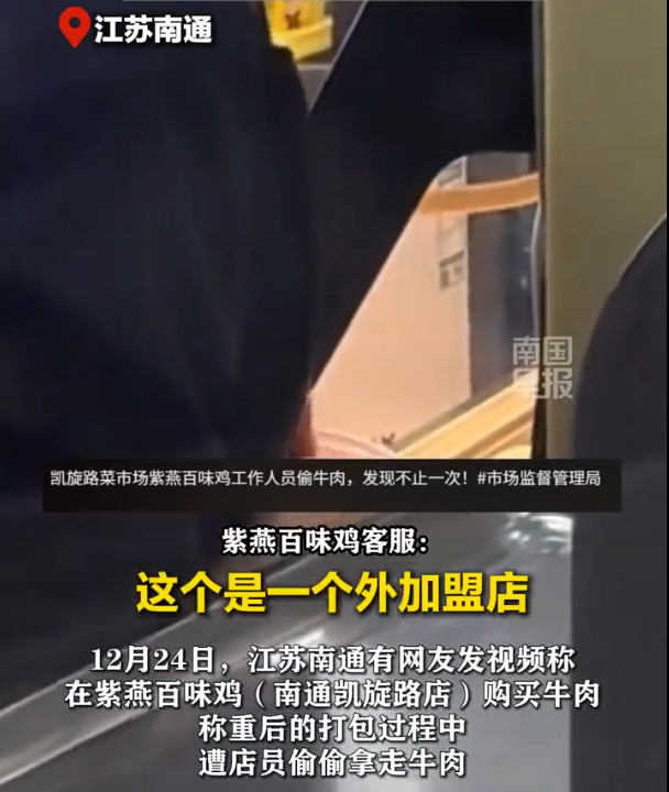 12月24日,江苏南通启东市凯旋路菜市场一家紫燕百味鸡门店被消费者曝光店员存在偷减牛肉行为。消费者李先生(化名)发布视频显示,店员在为其称重牛肉后,准备打包时将餐盒移至身后盲区,徒手快速抓取数块牛肉丢弃,整个动作娴熟。李先生在视频文字区明确表示,此类偷减行为“不止一次”,此次是特意提前准备录像才拍到实证,随后已拨打投诉电话等待处理。