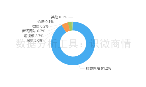该时段内,有关“紫燕百味鸡店员偷减牛肉事件”的舆情主要集中在社交网络平台,约占91.2%,其次为新闻APP(约占5.0%),短视频(约占2.7%)。