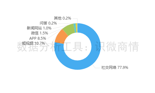 该时段内,有关“周大福牛马吊坠争议事件”的舆情主要集中在社交网络平台,约占77.9%,其次为短视频(约占10.7%),新闻APP(约占8.5%)。