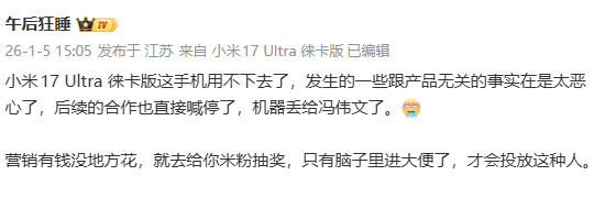 米系大V表态,“午后狂睡”宣布停止与小米17 Ultra的合作,称“只有脑子里进XX了,才会投放这种人”;一系列KML(指手机圈对小米系意见领袖)博主也宣布中止与小米合作并归还产品。