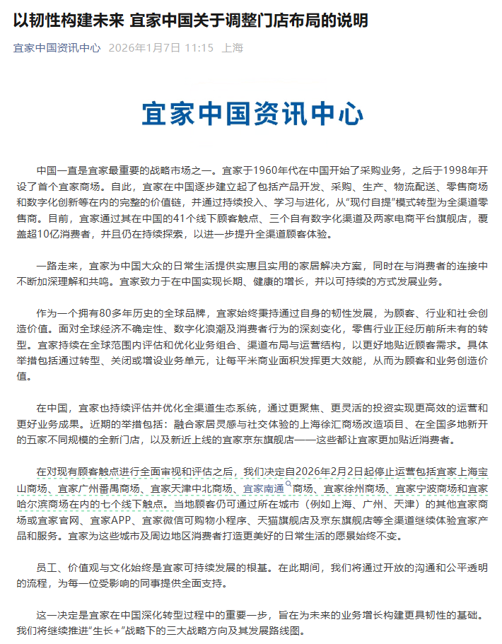 1月7日中午11时,宜家中国官方微信号“宜家中国资讯中心”发布《以韧性构建未来,宜家中国关于调整门店布局的说明》,正式宣布关闭7家门店: