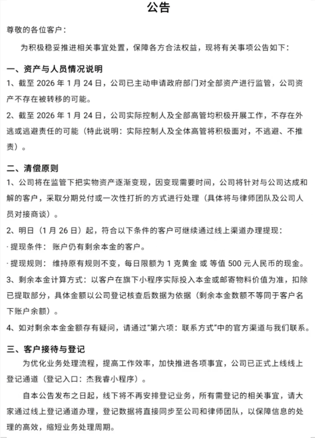 杰我睿负责人及核心管理人员均在岗,正开展沟通、资产梳理与兑付工作;