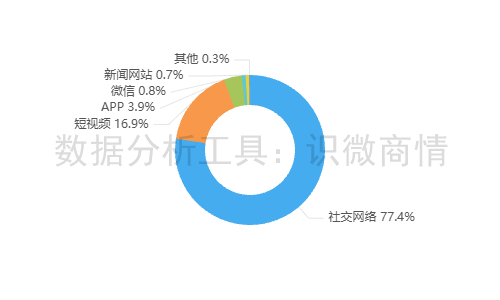 该时段内,有关“杰我睿事件”的舆情主要集中在社交网络平台,约91,723条,占77.4%,其次为短视频(约占16.9%),新闻APP(约占3.9%)。