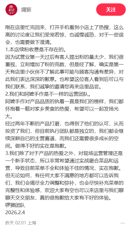 2月4日,鑼獅官方账号回应:续粉收费不存在;这是获得阿嬷手作投资的独立运营项目。