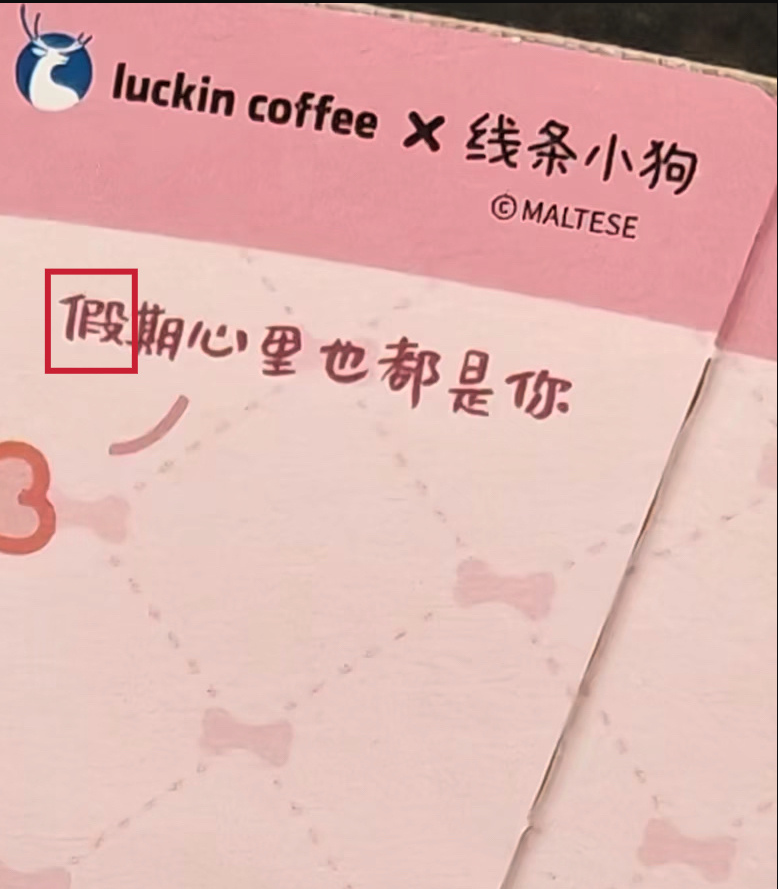 联名杯套出现错别字,引发品牌专业性质疑:瑞幸与线条小狗联名杯套上的“假期”一词中“假”字写错,被消费者发现后引发全网热议,网友质疑大品牌联名产品的品控和专业性,部分用户因此对品牌产生负面印象甚至表示“不买了”。