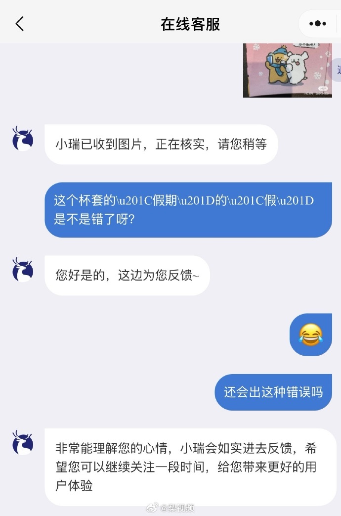 客服回应敷衍,未有效解决用户质疑:针对杯套错别字问题,客服仅表示“记录反馈”,未给出具体解决方案或致歉,被用户批评回应太敷衍,进一步激化负面情绪。