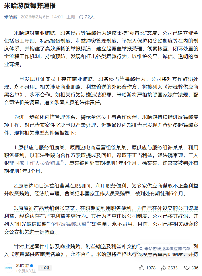 2026年2月6日,米哈游服务号发布《米哈游反舞弊通报》,公司近期通过内部排查已发现并查处多起舞弊案件,将相关典型案件通报。其中4人获刑,24家供应商因商业贿赂被列入黑名单,涉及文化传媒、网络科技等多领域。米哈游表示一旦发现并证实员工存在商业贿赂、职务侵占等舞弊行为,公司将对其作辞退处理,永不录用。相关涉及商业贿赂、利益输送的外部合作方,将被列入《涉舞弊供应商黑名单》,永不合作,并持续更新清单内容。