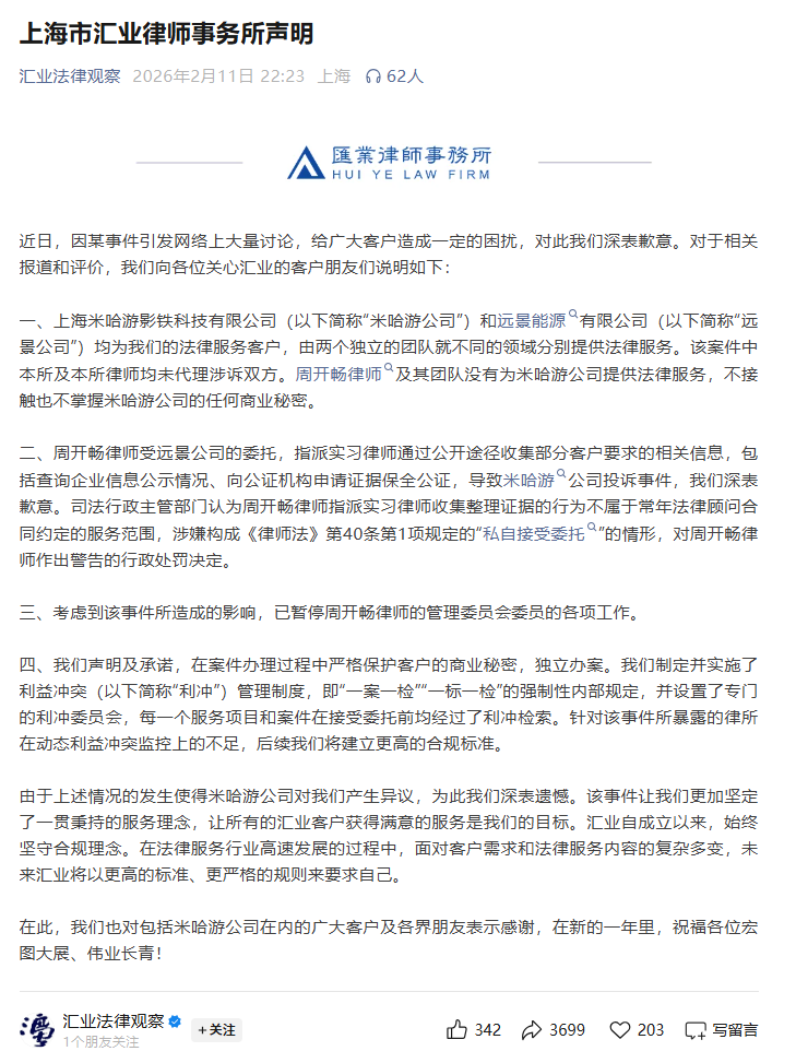 2月11日,汇业法律观察公众号发布《上海市汇业律师事务所声明》,承认米哈游与远景能源均为其客户,但由独立团队服务,强调周开畅团队未接触米哈游商业秘密。解释周开畅受远景委托,指派实习律师通过公开途径(企业信息公示、公证保全)收集信息。对事件造成的困扰深表歉意,已暂停周开畅管委会委员工作并启动内部调查。并承诺在案件办理过程中严格保护客户的商业秘密,独立办案。
