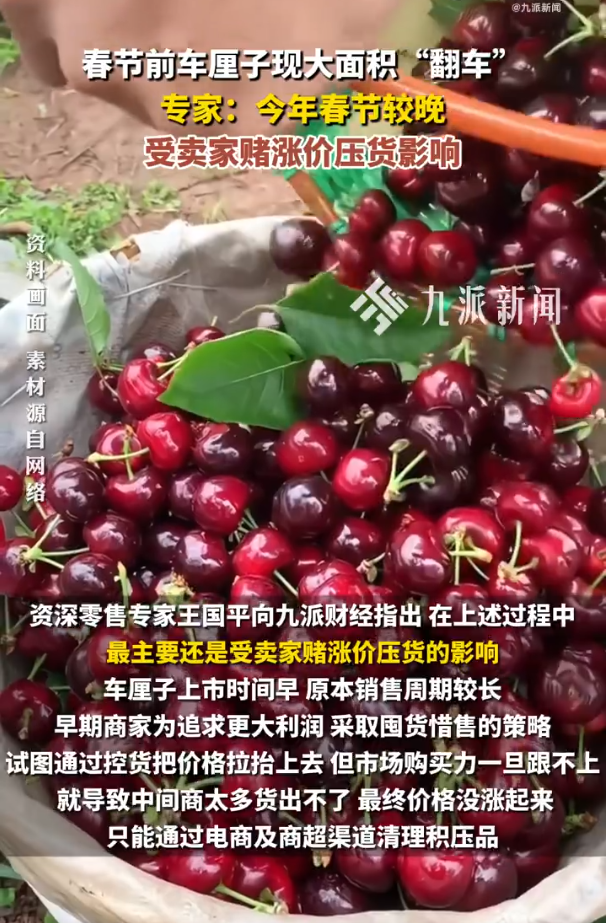 2月12日上午,九派新闻报道“车厘子卖家赌涨价压货,团购12箱车厘子收到陈年僵尸果:大部分已发霉烂掉,全部退掉”。零售专家指出,最主要还是受卖家赌涨价压货的影响。早期商家为追求更大利润,采取囤货惜售的策略,试图通过控货把价格拉抬上去,但市场购买力一旦跟不上,就导致中间商太多货出不了,最终价格没涨起来,只能通过电商及商超渠道清理积压品。