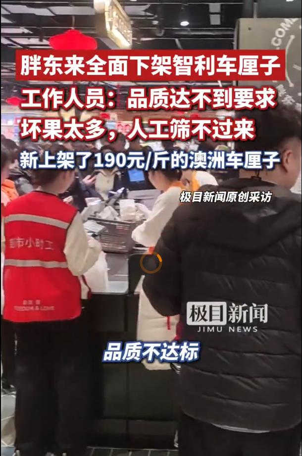 2026年2月9日,一网友发视频称沃尔玛、山姆、胖东来等大型超市已经将智利车厘子下架,因为今年闰一个月,导致所售车厘子状态特别差,引发不少网友共鸣。这条视频目前播放量35万。