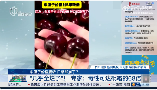 12日深夜,看看新闻Knews报道“霉变车厘子毒性可达砒霜68倍”,提醒“霉变水果中可能滋生黄曲霉素等强致癌物”。
