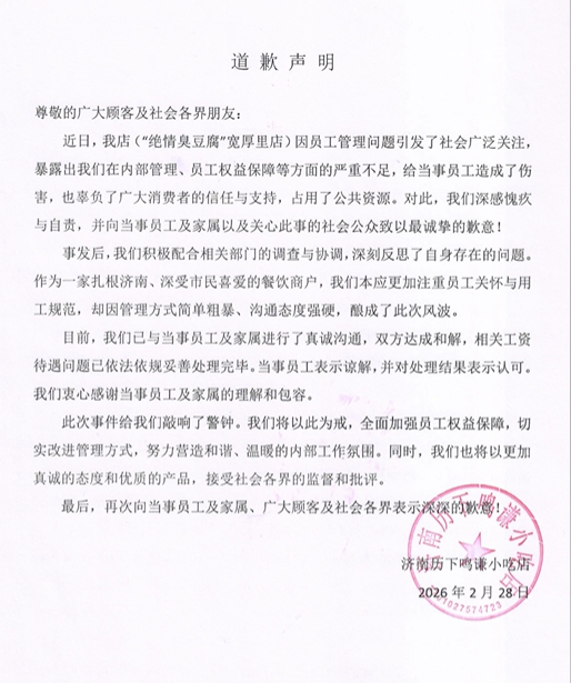 2月28日,“绝情臭豆腐”通过其社交账号发布致歉声明,承认店铺在员工管理、员工权益保障方面存在严重不足,向李师傅及家属、广大顾客和社会各界致以诚挚歉意,称已与李师傅及家属达成和解,依法妥善处理了相关工资待遇问题,并表示将以此为戒,加强员工权益保障、改进管理方式,接受社会监督。