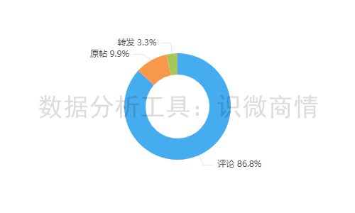 该段时间内,有关“绝情臭豆腐请假事件”的舆情信息类型以评论为主,占86.8%说明争议非常大;其次为原帖,占9.9%;转发较少,占3.3%。