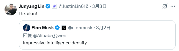同日,林俊旸在X平台发布Qwen3.5系列小尺寸开源模型(0.8B/2B/4B/9B),马斯克点赞称“智能密度令人印象深刻”,林俊旸回复“谢谢埃隆”。