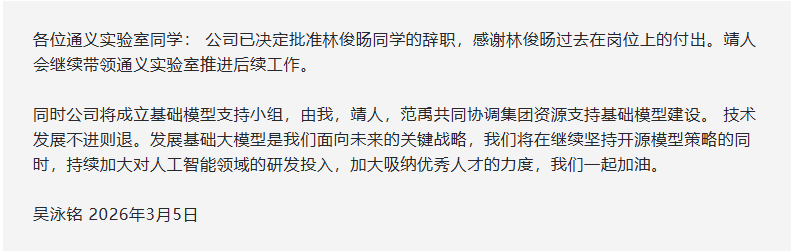 2026年3月5日上午,阿里CEO吴泳铭发布内部邮件,正式批准林俊旸辞职,明确后续安排。由周靖人继续带领通义实验室,并成立由吴泳铭本人、周靖人、范禹组成的基础模型支持小组,在集团层面统筹资源。