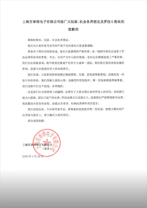 3月27日凌晨,上海百事得电子有限公司通过抖音账号“罗技”(旗舰店账号)发布《上海百事得电子有限公司给广大玩家、社会各界朋友及罗技G粉丝的致歉信》: