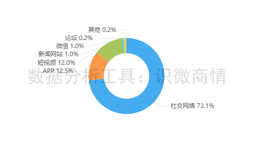 该时段内,有关“罗技广告侮辱消费者事件”的舆情主要集中在社交网络平台,约占73.1%,其次为新闻APP(约占12.5%),短视频(约占12.0%)。