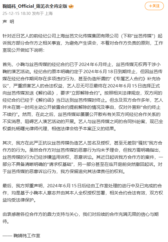 2025年12月15日,鞠婧祎工作室发声明,指控丝芭伪造补充协议、长期截留收入,称合约已合法终止。