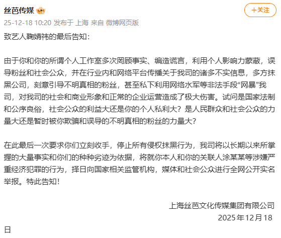 2025年12月18日,丝芭发《致艺人鞠婧祎的最后告知》,威胁将实名举报鞠婧祎“涉嫌严重经济犯罪”。