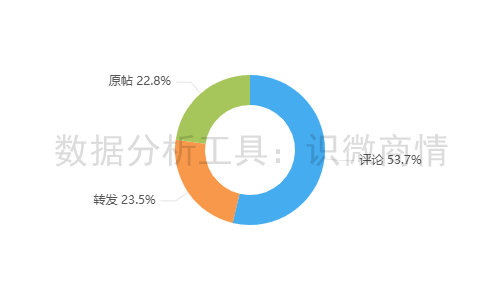该段时间内,有关“鞠婧祎涉税风波”的舆情信息类型以评论为主,占53.7%;其次为转发,占23.5%;原帖较少,占22.8%。