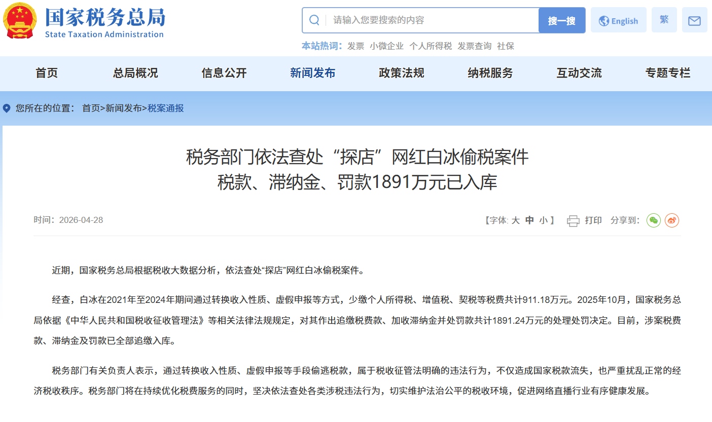 2026年4月28日,税务总局官网发布“税务部门依法查处“探店”网红白冰偷税案件税款、滞纳金、罚款1891万元已入库”: