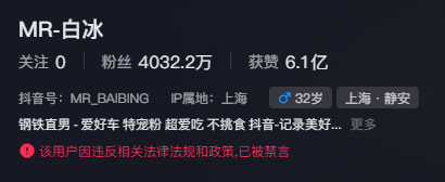 白冰,抖音美食探店头部博主,粉丝超4000万,视频报价最高达1分钟132万元,全平台粉丝超4049万。