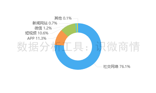 该时段内,有关“网红白冰偷税事件”的舆情主要集中在社交网络平台,约占76.1%,其次为新闻APP(约占11.3%),短视频(约占10.6%)。