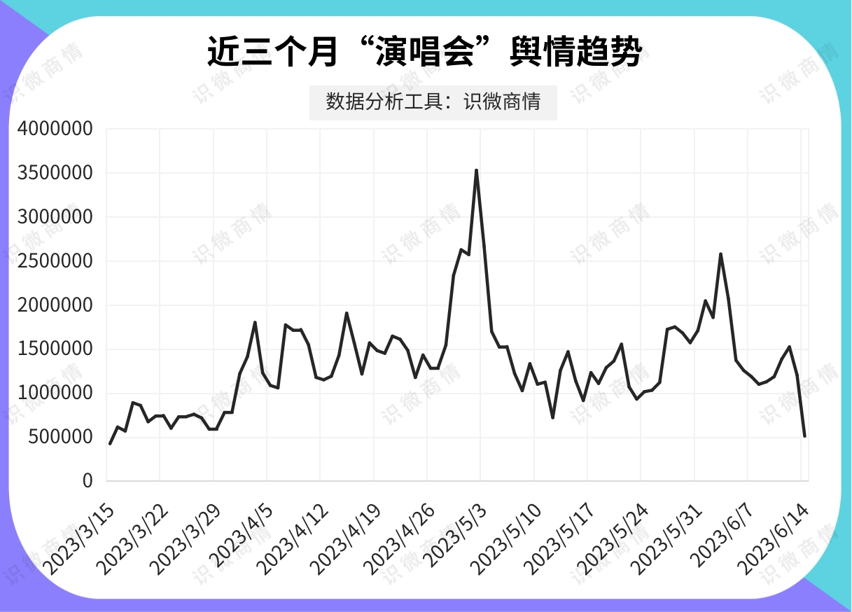 线下演艺市场的火爆的同时,也暴露出各种各样的问题,屡次引发舆论热议。这其中既有观众对演唱会的“观后感”,也有对购票难之类的吐槽声。根据识微商情舆情监测系统显示,近三个月(2023年3月15日-6月14日)全网有关“演唱会”的信息约1.21亿,整体舆情热度呈现逐渐增长的趋势。尤其是时代少年团、王源等流量型艺人及五月天等成名已久的艺人在举办演唱会后都会带来舆情的爆发(对应下图的“异军突起”)。