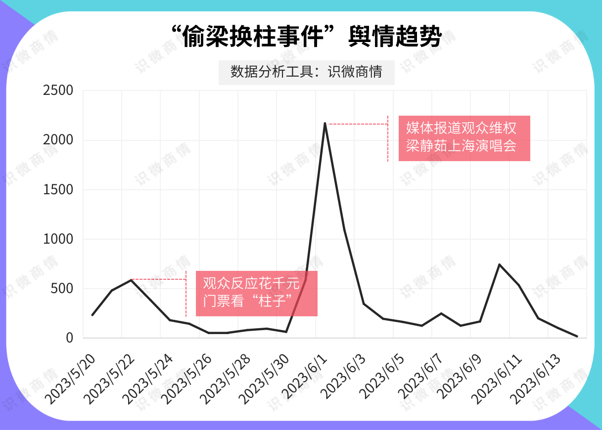 6月1日,对于梁静茹上海演唱会偷梁换柱维权事件,根据识微商情系统分析的网络上负面情绪高涨。