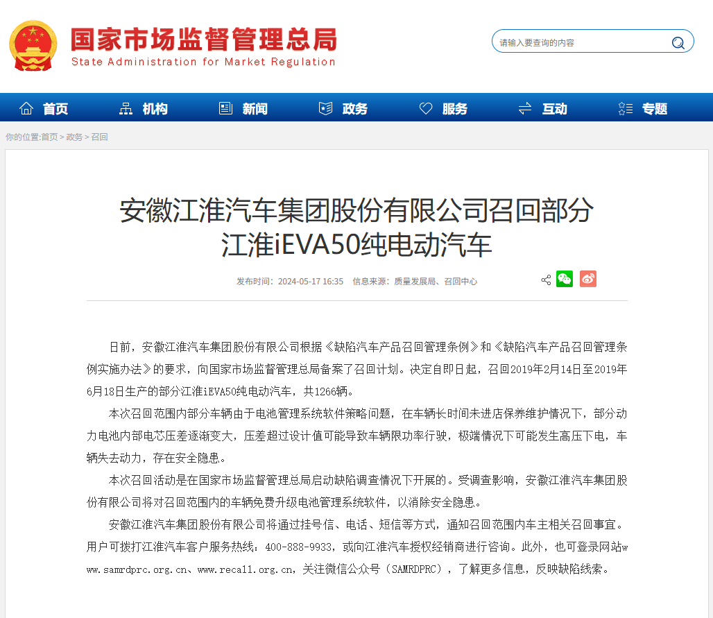 三电系统故障:2024年5月,市监总局网站更新一则召回公告,5月17日,安徽江淮汽车集团股份有限公司宣布召回2019年2月14日至2019年6月18日生产的部分江淮iEVA50纯电动汽车。