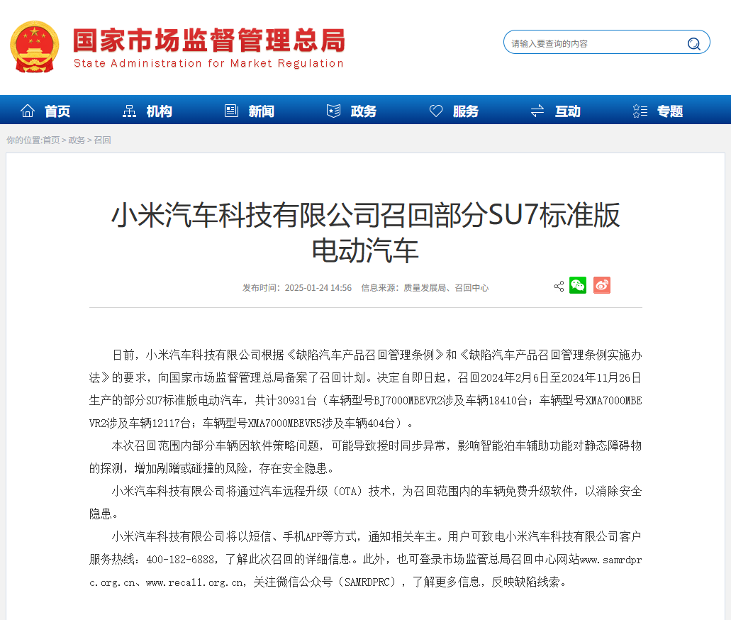 智能化功能失效:2025年1月,市监总局网站更新一则召回公告,1月24日,小米汽车宣布召回2024年2月6日至2024年11月26日生产的部分SU7标准版电动汽车。