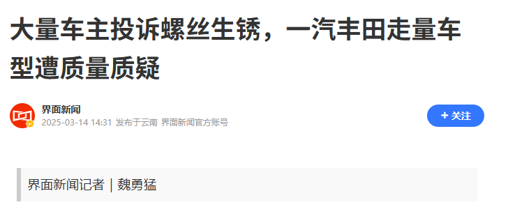 品牌回应/行动:一汽丰田官方客服让车主联4S店处理,还表示质保期内可以免费维修。