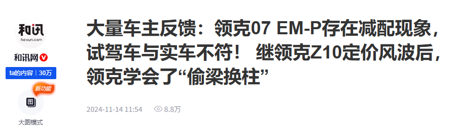 配置减配争议:2024年11月和讯网报道,大量车主反馈,领克07 EM-P存在减配现象——在此前的官方宣传中,领克07 EM-P的多个版本具备内后视镜防眩目功能。但用户们提车后却发现,这一功能被偷偷“阉割”了,不仅涉嫌虚假宣传,更是对行车安全构成严重威胁。