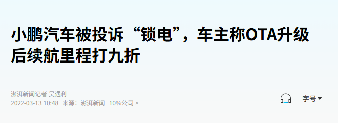 2022年3月13日澎湃新闻报道,不少车主投诉称,自己的车在去年年末经过一次OTA(汽车远程升级)后,续航里程明显下降,怀疑小鹏汽车通过OTA的方式对车辆进行了“锁电”,这些车主均是小鹏P7的首批用户。