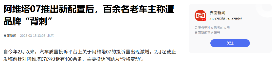 迭代与新车贬值:2025年3月15日界面新闻报道,2月以来,汽车质量投诉平台上关于阿维塔07的投诉量出现激增,主要投诉问题为“价格变动”。去年9月,阿维塔07上市,,上市之初共有Ultra、Max和Pro三种配置可选。今年2月18日,阿维塔07又推出了一款Pro+版本,将原来需要选装的配置变为标配,并且限时优惠2万元,原本Pro版本售价与Max版本价格相差2万元,但增配的Pro+版本上市时价格却与Max车型价格相差了4万元,新车型推出后并无差价补偿机制,引发车主不满。