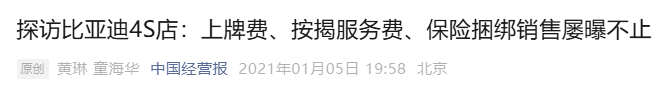捆绑消费陷阱:2021年1月5日中国经营报报道,记者暗访比亚迪4S店遇到收取多项服务费的情况,店内销售人员表示:“贷款购车需缴纳3000元按揭服务费和1500元上牌费,且必须在店内购买8000元车险。”2019年比亚迪曾发布公告禁止经销商以汽车金融费名义向客户收取任何费用,但比亚迪4S店却开始以按揭服务费等名称收取费用。