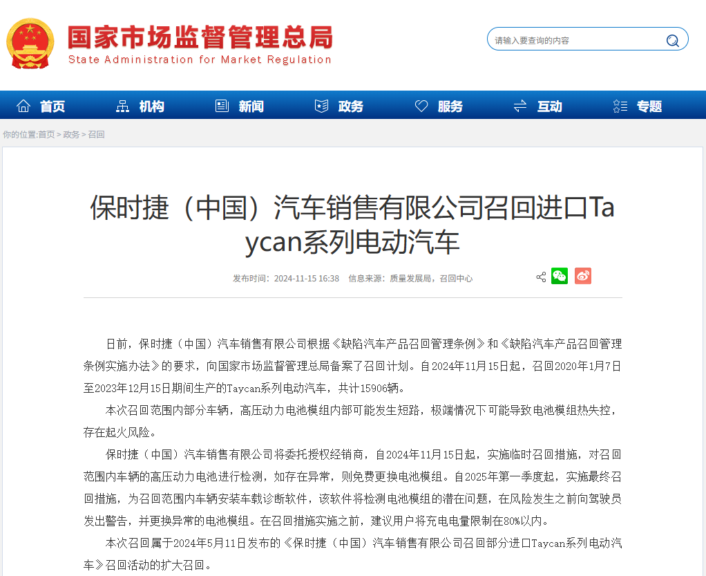 电池热失控风险:2024年11月15日,市监总局网站更新一则召回公告,保时捷(中国)汽车销售有限公司宣布自11月15日起,召回2020年1月7日至2023年12月15日期间生产的Taycan系列电动汽车。