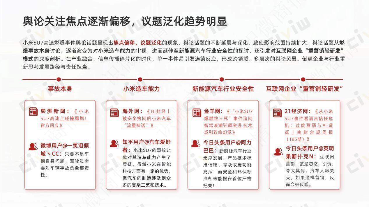 小米SU7高速燃爆事件舆论话题呈现出焦点偏移,议题泛化的现象,舆论话题的不断延展与深化,致使影响范围持续扩大。舆论话题从燃爆事故本身讨论,逐渐演变为对小米造车能力的审视,进而延伸至新能源汽车行业安全性的探讨,还引发对互联网企业“重营销轻研发”模式的深度剖析。